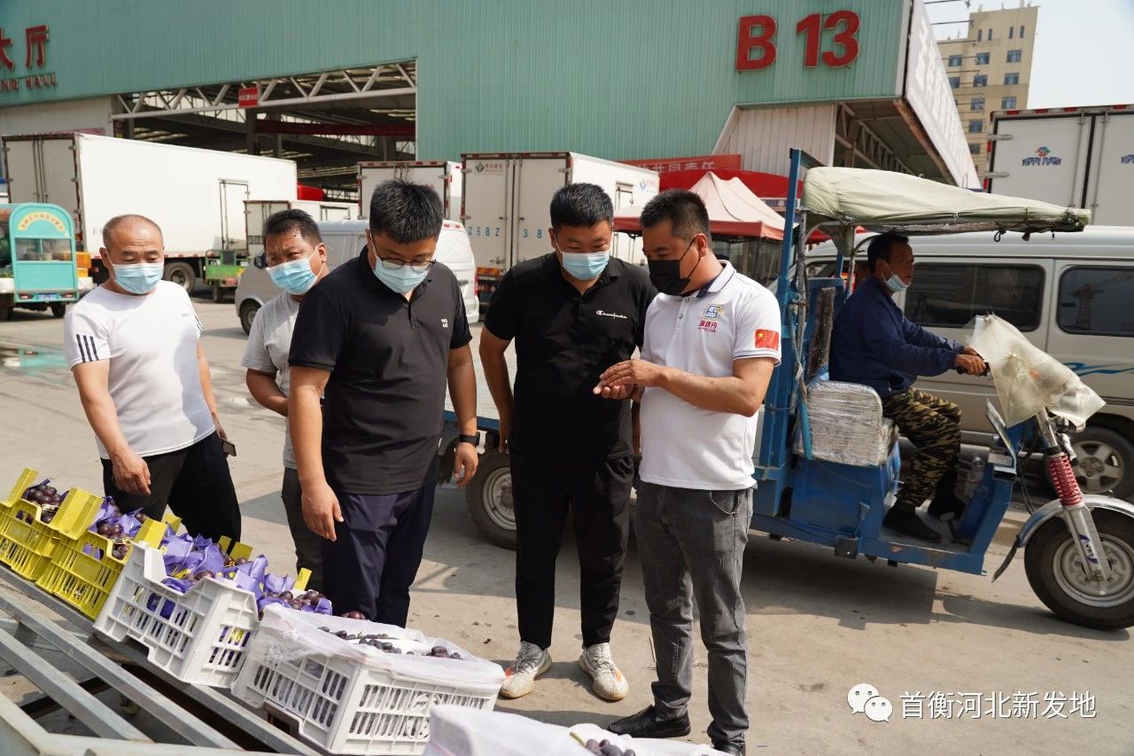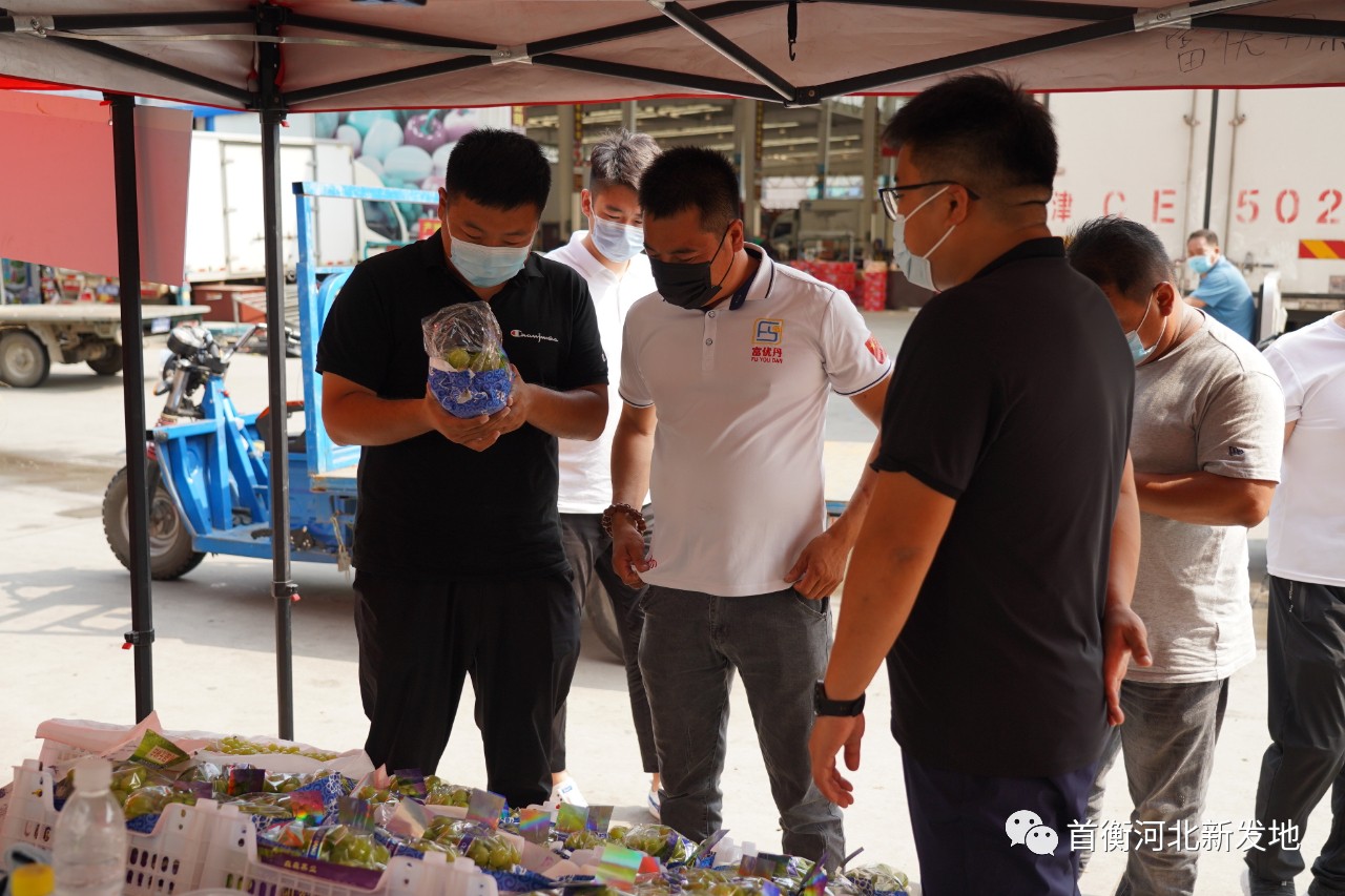 8月5日,繼順平蘋果對接后,徐水葡萄產銷對接活動順利落實。保定市徐水區農業局帶隊,徐水劉伶田園小鎮總裁助理王森一行到高碑店市場葡萄專區就市場行情、在售品種、銷售渠道進行深入了解,并就葡萄種植、采摘、存儲等相關問題與場內商戶展開深入交流。